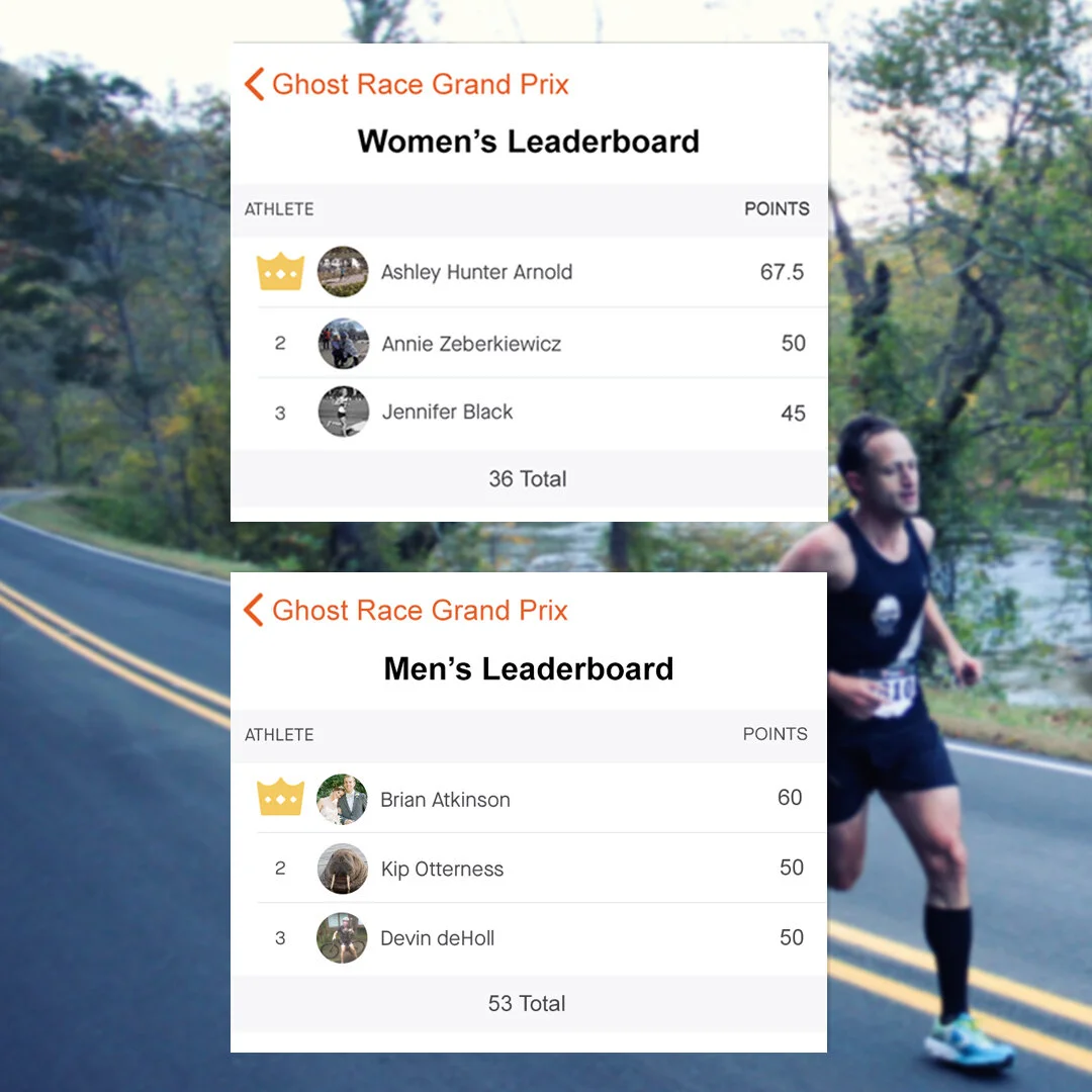 The Ghost Race Grand Prix has come to its conclusion. After days of nonstop number crunching, the point totals are in and the leaderboard is set. Congrats to Ghost Race Grand Prix champions Ashley Hunter Arnold and Brian Atkinson. Both athletes were able to distance themselves from their closest competitors thanks to bonus points scored for multiple course records. Highlights included Ashley’s 6:32 on Haywood Halfpipe, which was just 2 seconds shy of the previous overall CR, and Brian’s 7:31 on Sunset to Toll Road - a 5:19 average pace on a 1.4 mile course that featured nearly 200 feet of gain. Phenomenal efforts like this earned each runner the top spot on the podium and a $75 gift certificate to Jus Running.